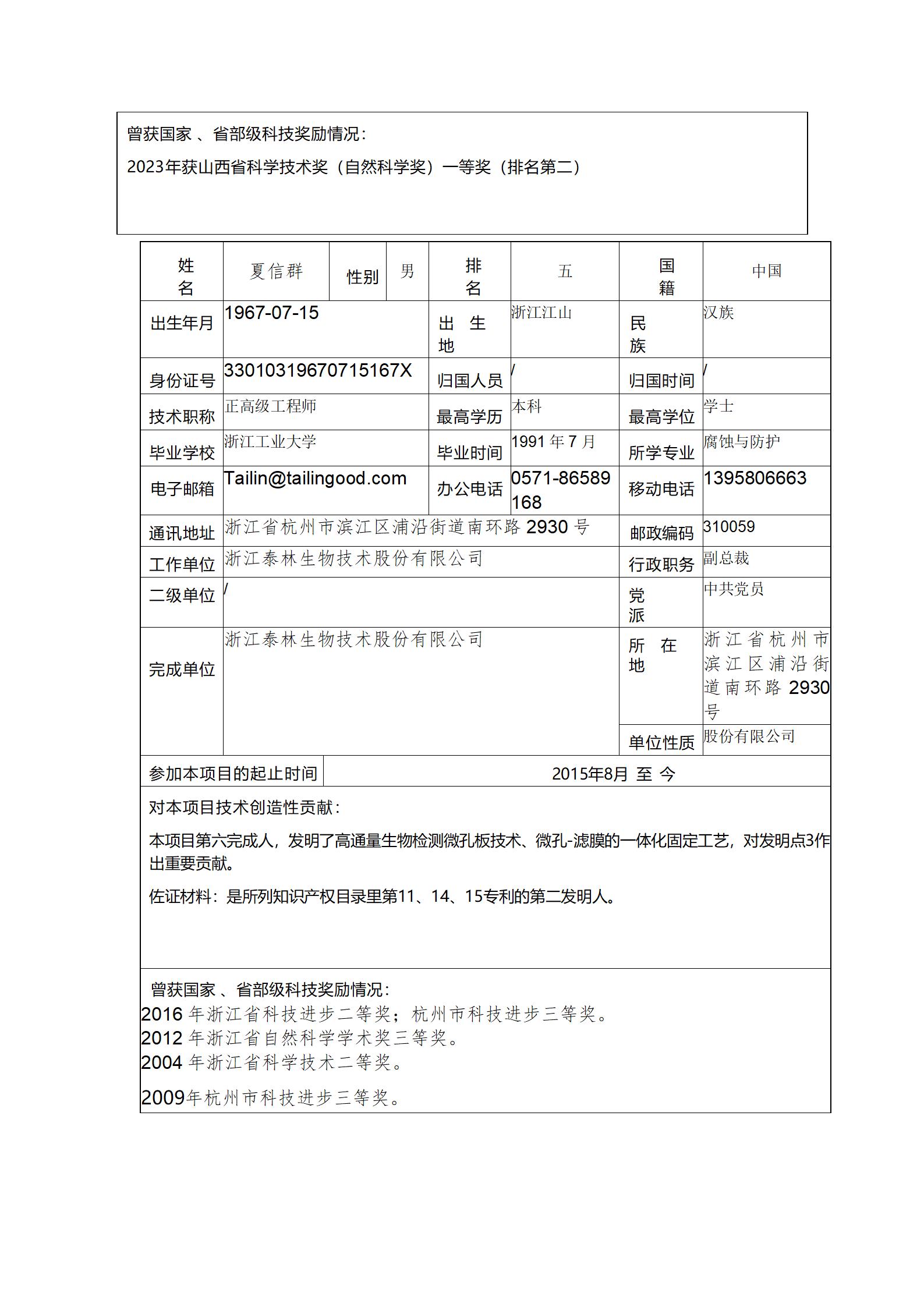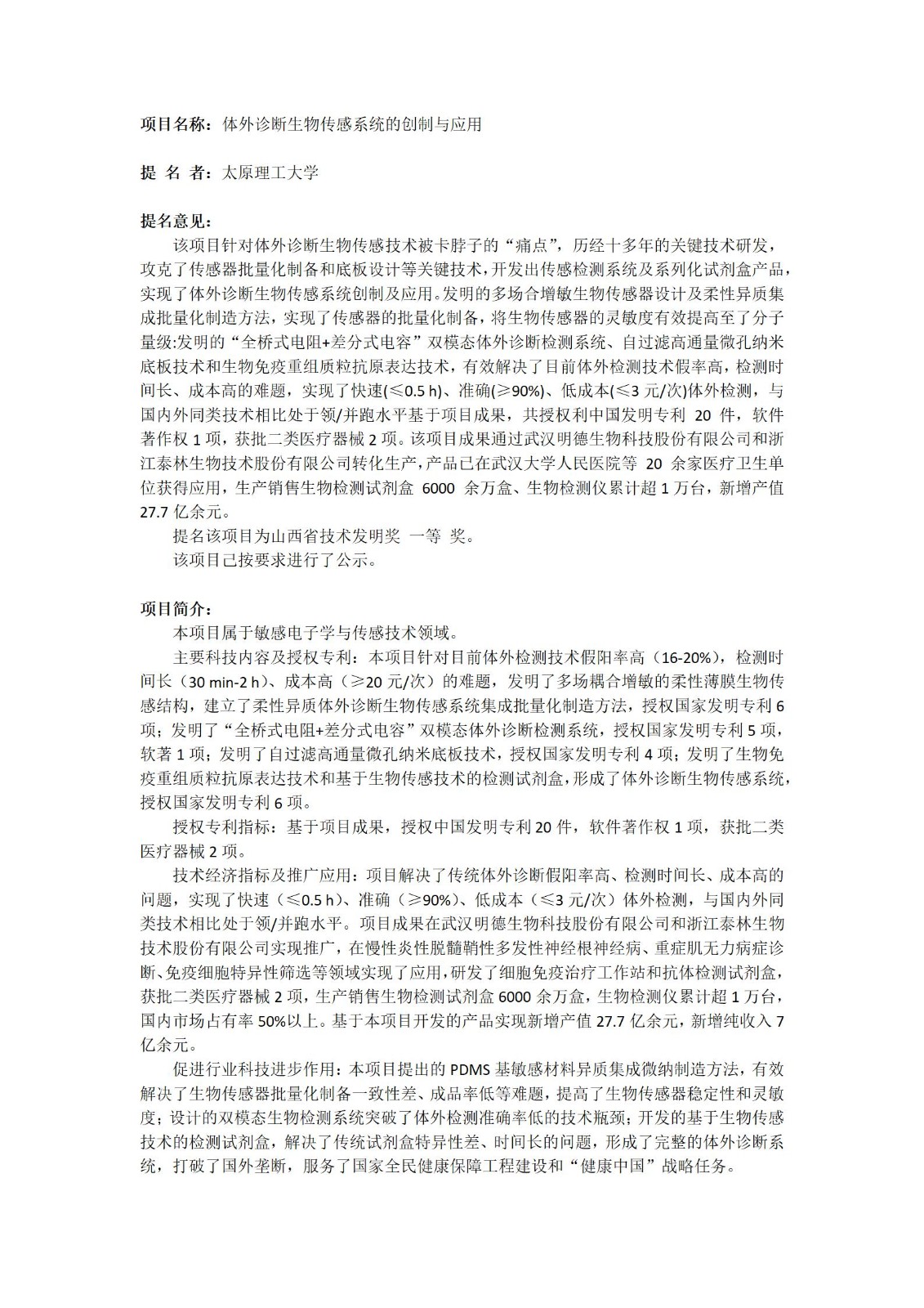 根據(jù)山西省科學(xué)技術(shù)廳關(guān)于山西省技術(shù)發(fā)明獎(jiǎng)提名工作的相關(guān)規(guī)定,浙江泰林生物技術(shù)股份有限公司、太原理工大學(xué)、武漢明德生物科技股份有限公司合作研發(fā)的科技成果“體外診斷生物傳感系統(tǒng)的創(chuàng)制與應(yīng)用”擬提名2024年度山西省技術(shù)發(fā)明獎(jiǎng)一等獎(jiǎng),現(xiàn)予以公示。公示期2024年12月09日至2024年12月15日。